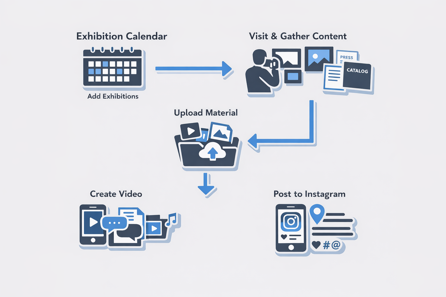 Clio documents exhibitions through a streamlined workflow: shows are logged, visited in person, and captured through clean installation footage and supporting materials. Assets are organized centrally, used to generate short AI-assisted audio reviews, and paired with concise videos. Each exhibition is then shared as Instagram Reels, creating an accessible, consistent archive of contemporary shows.